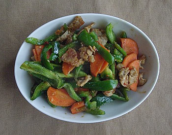 1.豚肉は一口大、ピーマンはへたと種を取り細切り、にんじんは皮を剥いて5mm厚さの半月切りにする。