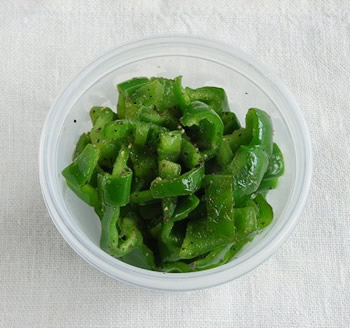 1.ピーマンは縦半分に切った後、種をとり、幅1cmに切る。