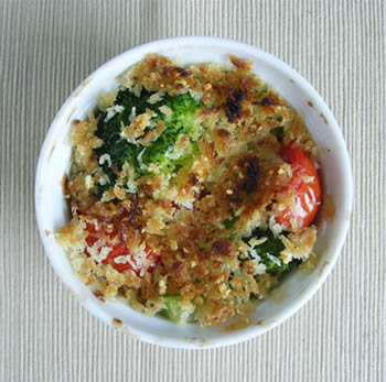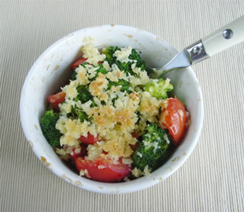 3.ブロッコリーは耐熱容器に入れてラップをして電子レンジで1~2分加熱して、塩、こしょうを振る。熱いうちに、トマトを入れて、Aをかける。