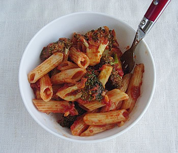 3.鍋にたっぷりの湯を沸かして、塩小さじ2を加えて、ペンネをゆでる。ゆで時間の1分前にブロッコリーを入れる。