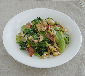 2.フライパンにバターを溶かし、ベーコンを炒める。続いて、レタスを入れて炒め、最後に溶き卵を入れて炒め、塩、こしょうで味を調える。