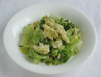 2.フライパンにごま油としょうがを入れて火にかけ、いい香りがしてきたら、レタスを入れて、少ししなっとしてきたら、卵を入れて、大きくかき混ぜる。