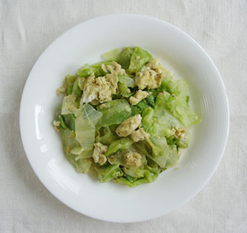 2.フライパンにバターを熱し、にんにくをいため、いい香りがしてきたら、レタスをちぎりながら入れて、炒める。