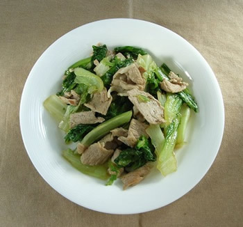 2.フライパンに油を熱し、豚肉をいためる。豚肉の色が変わったら、レタスを加えてしんなりしたら、しょうゆ、みりんを回し入れて混ぜる。