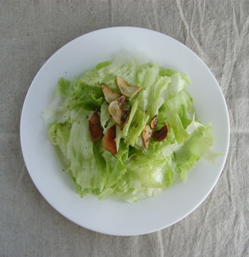 2.フライパンにオリーブ油を熱し、じっくりにんにくを炒め、きつね色になったら、1のレタスにオリーブ油ごと全部かけ、しょうゆをかける。