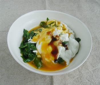 3.穴の開いたお玉で、ポーチドエッグをすくい、レタスにのせる。ソースをかける。