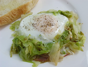 2.サラダ油をフライパンに熱し、ハムを並べ、レタスをのせて、真ん中をあけ、卵を割りいれる。ふたをして約2~3分蒸し焼きにし、塩・こしょうを振る。