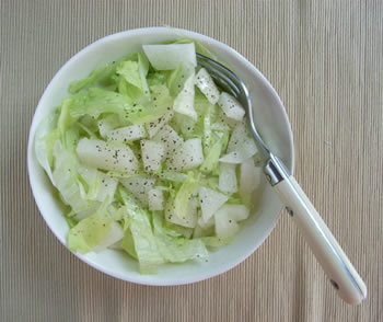 お湯を沸かして、塩と油を入れ、レタスをさっとゆでて、とりだしたら、しょうゆをかけるだけです。なんと簡単な。でも美味しい。