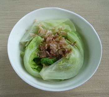 レタスの湯引きの応用編。かつおぶしと、醤油をかけただけの