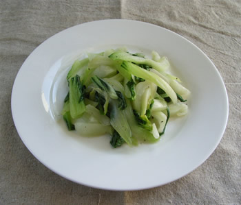 2.フライパンにオリーブ油を熱し、にんにくを炒め、香りが立ったら、チンゲンサイを茎から入れる。水を入れてしばらく炒め、茎がしんなりしてきたら、葉を入れて、塩、こしょうで味を調える。しょうゆはなくてもいい。
