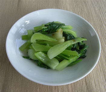 2.小鍋に湯を沸かし、沸騰したら、塩とサラダ油を入れてから、チンゲンサイの茎を入れる。そのあと再沸騰したら、葉を入れる。