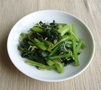 3.小松菜がしなっとなったら、ちりめんじゃこを混ぜて、しょうゆを振り、器に盛る。