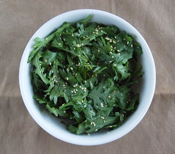 2.春菊を器に入れて、ごま油を回しいれ、全体を混ぜる。