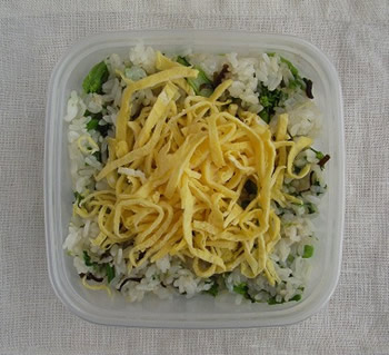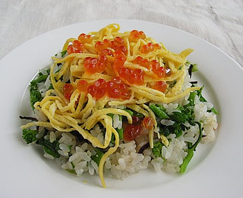 菜の花が出回るこの時期ならではのレシピ。春に向かって、ちょっと苦い野菜を食べるのは体にとてもいいらしいですよ。これは昔何かの雑誌の切り抜きから。ちょっと寝かしてから食べてもおいしい。彩りのために、イクラが入ってますが、なくても十分おいしいです。(て言うか、ない方が、菜の花や塩昆布の美味しさが際立っていいかも。錦糸卵はあった方がいいな~)