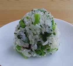 4.ご飯が炊けたら、菜の花と、塩昆布を入れ、混ぜる。