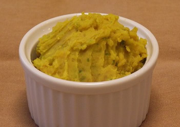 3.かぼちゃが熱いうちに、フォークでつぶしてマッシュにする。