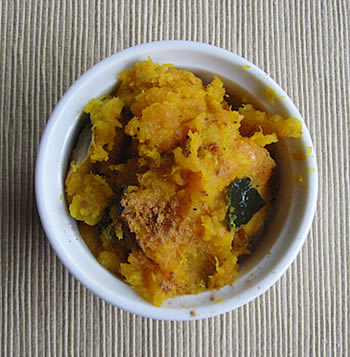 2.かぼちゃが熱いうちに、フォークの背でつぶし、バター、ハチミツを入れて混ぜる。シナモンをかける。