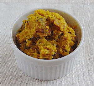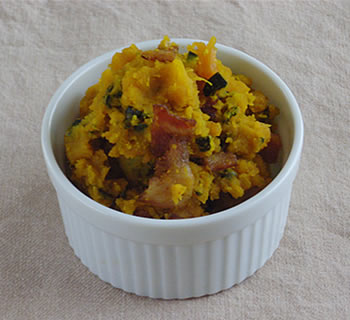 3.かぼちゃを熱いうちにマッシュし、ベーコンを入れ、塩、こしょうで味を整える。