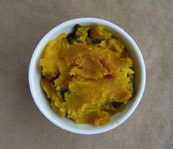 2.かぼちゃが充分柔らかくなったら、フォークの背等で軽くつぶして、はちみつを入れて混ぜる。
