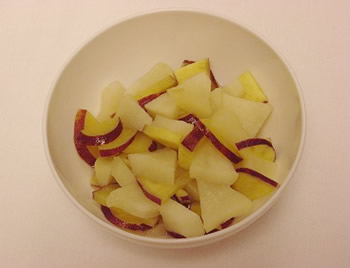 2.りんごは半分に切ったものを、4つ割りにして、皮と芯をとり、1cm厚さのいちょう切りにし、砂糖をまぶしておく。