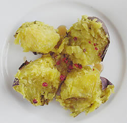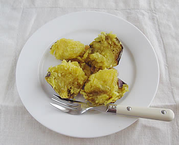 1.さつまいもは皮付きのまま洗い、オーブンレンジに入れてから、予熱をはじめ、220℃に温まったら30分焼く。