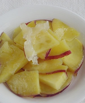 1.さつまいもは3mm厚さの半月切りにして、5分程水にさらす。