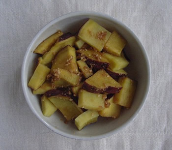 3.すりごま、しょうゆ、酢、砂糖を器の中で混ぜておき、その器に2のさつまいもを入れて和える。
