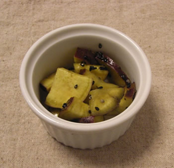 ゆで(またはふかし)さつまいもに、メープルシロップと黒ごまをかけただけ。