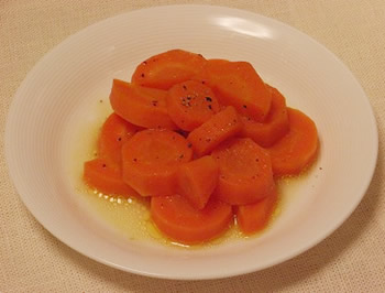 2.耐熱容器に、にんじんと、水と、バターを入れて、ラップをし、電子レンジで3~4分加熱する。