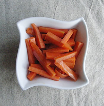 1.にんじんは7~8mm角の拍子切りにし、ポリ袋に入れ、ポン酢を入れたら、口を閉めて、2時間以上漬ける。