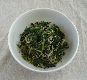 2.フライパンにごま油を熱し、にんじんの葉をよく炒め、ちりめんじゃこを加えて、さらにいためる。最後に昆布つゆを入れて、白ごまをいれ、全体を混ぜたら火を止める。