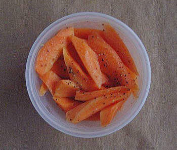 生のにんじんに塩、酢、ごま油、黒こしょうをかけただけです。主食がこってりしているときには、是非こんな副菜を!