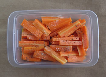 1.にんじんを拍子切りにして、塩、こしょうをかける。