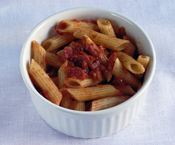 9.ペンネは水気を切り、ソース(上記の1/4位)と混ぜる。好みで粉チーズをかけて。