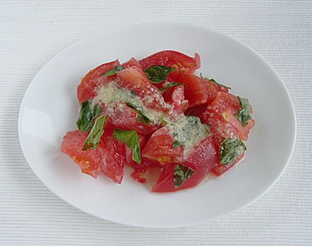 2.器にトマトをのせて、バジルの葉をちぎってのせ、ドレッシングをかける。