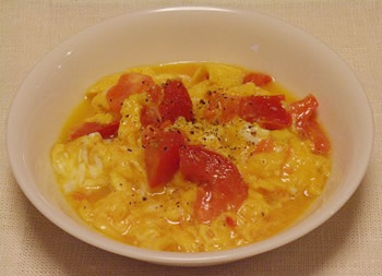 1.トマトは、2~3cm角に切り、ボウルに入れ、卵、塩、砂糖を入れてかき混ぜる。