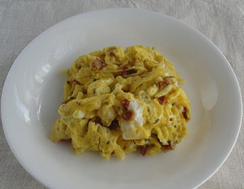 2.フライパンにオリーブ油を熱し、卵液を一気に入れて、大きく一混ぜしたら、火を止めて、余熱で火を通す。(その間もさらっとかき混ぜて)