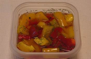 3.ボウルにオリーブ油、酢、砂糖、塩を入れて混ぜ、ピーマンを入れる。