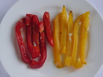 2.パプリカの種を取り、縦に1cm幅に切り、1に並べる。
