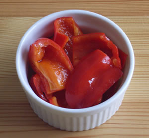 2.器にAの材料を全部入れ混ぜ、1の赤ピーマンをつけて、味をなじませる。