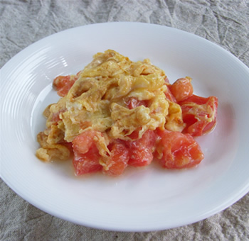 2.卵を溶きほぐして、砂糖、塩を混ぜ、トマトを入れる。