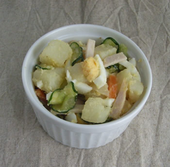 1.じゃがいもは、皮をむき、1.5cm角に切り、水にさらしてアクを取る。にんじんは薄いいちょう切り。キュウリは薄い輪切りにして、塩をふっておく。ハムは短め太めの千切りに。