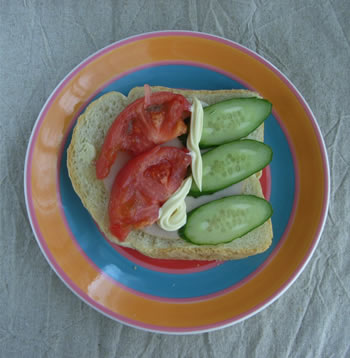ハムと、トマトと、きゅうりをはさんで、マヨネーズをかけただけ。