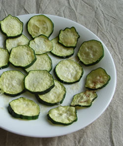 1.ズッキーニは5mm幅の輪切りにして、耐熱皿に並べ、