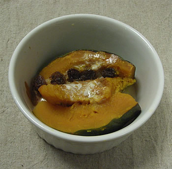 2.かぼちゃが十分柔らかくなったら、容器に移し、バニラアイスやシナモン、レーズンを入れて、頂く。