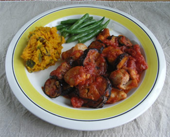 (付け合せは、かぼちゃのマッシュサラダと、いんげんのオリーブ油ソテー)
