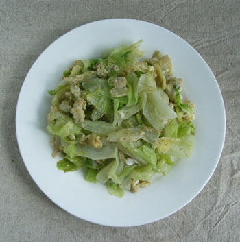 2.フライパンにバターを溶かして、レタスを炒める。しんなりしたら、空いたところに卵を入れて、しばらくしたらかき混ぜ、塩・こしょうで味を調える。