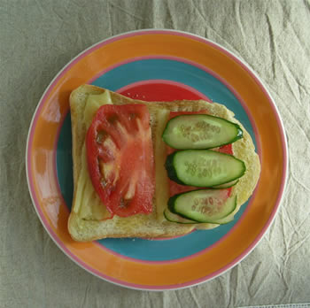 3.2に、チーズ、トマト、きゅうりをのせ、塩を轢き、はさんで食べる。
