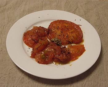2.フライパンにサラダ油を中火で熱し、トマトを並べて1~2分焼き、ひっくり返して、さらに1~2分焼く。