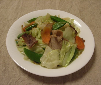 1.キャベツは食べやすい大きさに切る。スナップえんどうは筋を取り、半分に切る。にんじんは薄い半月切り。豚肉は脂身を取り除いておく。